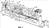 Верхняя панель 48 каретки 32 может поворачиваться относительно верхней направляющей 58. Пружина 94 между верхней панелью 48 и боковой панелью 46 отжимает верхнюю панель 48 вниз для удержания кассеты 34 внутри каретки 32. Установочный кулачок 96 располагается позади боковой панели 46 и совмещается с выталкивающей лапкой 98, которая отходит наружу и вниз от верхней панели 48 и которая может выступать через отверстие 100 в боковой панели 46 при повороте верхней панели 48 вверх. Такой поворот верхней панели 48 освобождает кассету 34, и выталкивающая лапка 98, выступающая через отверстие 100, выталкивает кассету 34 из каретки 32 в короб для отработанных кассет.