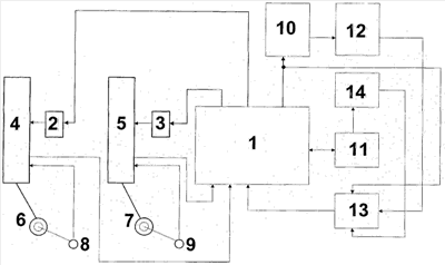 Вычислительный блок 13 принимает сигналы с датчика положения типа вал-код о текущем положении валков, с выхода первого блока управления о заданной скорости вращения двигателя главного привода стана ХПТ, а также со второго задатчика 14 об уставках и коэффициентах, соответствующих установленному калибру и маршруту прокатки.