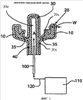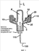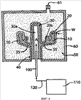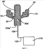 На фиг.1 трубка 100 подачи пара показана расположенной в вытянутой камере 30а полого литника 30 узла 40 моделей для подачи водяного пара (показано стрелкой А) при приблизительно атмосферном давлении внутрь полого литника 30 узла 40 моделей для соприкосновения с восковым узлом моделей и его расплавления, в то время как внешняя поверхность 20s формы 20 находится приблизительно под воздействием давления окружающего атмосферного воздуха (“давление окружающей среды”). Окружающий воздух, образующий атмосферу неконденсируемого газа вокруг формы 20 на фиг.1, может находиться при температуре окружающей среды либо может быть охлажден по сравнению с окружающей средой. Например, типичный восковой материал, из которого выполняется узел 40 моделей, расплавляется и становится вполне текучим при около 180°F. Водяной пар при давлении, близком к атмосферному, вырабатывается в источнике 110 водяного пара, который может включать обычный парогенератор, выпускаемый под наименованием “Model LB240” фирмой The Electro Steam Generator Corp. Водяной пар поступает от парогенератора или источника 110 по подводящей трубе 120 к трубке 100 подачи пара. Подачу потока водяного пара от источника или генератора 110 можно регулировать давлением в парогенераторе с тем, чтобы через трубку в литейную форму попадало достаточно пара для замещения сконденсировавшегося пара.