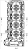 К причинам, препятствующим достижению указанного ниже технического результата при использовании известного устройства, принятого за прототип, относится то, что при его реализации в рубашке охлаждения головки цилиндров протекает несколько отдельных (изолированных друг от друга) потоков охлаждающей жидкости, что при экстремальных температурных нагрузках из-за ограниченной пропускной способности отдельных каналов создает дефицит охлаждающей жидкости в зонах с высокой температурой, может вызвать локальные перегревы в головке цилиндров и привести к структурным изменениям материала головки, ее разрушению и отказам двигателя, кроме того, наличие локальных перегревов в материале головки (полей с различным уровнем температур) приводит к возникновению температурных напряжений в узлах силовых элементов головки и деформациям рабочих поверхностей, что также снижает ресурс и надежность двигателя. Кроме того, наличие формовочных уклонов по всей высоте рубашки охлаждения и многочисленных перегородок, уменьшающих проходные сечения каналов, увеличивает массу головки и усложняет литейную оснастку в том числе за счет необходимости подведения к массивным узлам отливки дополнительных питателей.