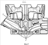 Наиболее близким устройством того же назначения к заявленному изобретению по совокупности признаков является литейный стержень рубашки охлаждения головки цилиндров двигателя внутреннего сгорания с жидкостным охлаждением (см. патент ЕПВ 1143135, МПК F02F 1/36, 10.10.2001) с каналами для подвода охлаждающей жидкости к стенкам камер сгорания, седлам клапанов, распылителям топливных форсунок и направляющих втулок клапанов, состоящий из двух стержней, имеет два продольно расположенных параллельных канала (один со стороны впуска, другой со стороны выпуска) и центральный канал, разделенный на верхнюю и нижнюю части, причем верхняя часть центрального канала сообщается с каналом со стороны выпуска, а нижняя часть центрального канала сообщается с каналом со стороны впуска.