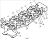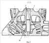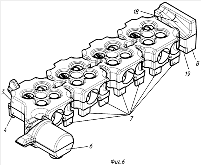 На фиг. 1 изображен вид головки цилиндров сверху; на фиг.2 – сечение Е-Е головки цилиндров; на фиг.3 – сечение Д-Д головки цилиндров; на фиг.4 – комплект литейной оснастки (литейная форма), вид сверху; на фиг.5 -сечение А-А литейной формы; на фиг.6 – общий вид стержня рубашки охлаждения головки цилиндров в сборе; на фиг.7 – общий вид нижней части стержня рубашки охлаждения головки цилиндров; на фиг.8 – стержень рубашки охлаждения головки цилиндров, вид сверху; на фиг.9 – сечение С-С стержня рубашки охлаждения головки цилиндров; на фиг.10 – сечение В-В стержня рубашки охлаждения головки цилиндров.