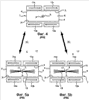 Когда батарею индукторов опускают на 10 или 15 см вниз, примерно до половины высоты кристаллизатора и даже до упора в нижний кессон 20 (см. фиг. 3а), конфигурация перемешивания соответствует нижнему функциональному положению РВ. В нижнем функциональном положении РВ электромагнитное перемешивание максимально ощущается на уровне выходных отверстий 17 стакана 5 там, где оно и требуется, хотя активная часть индукторов тоже смещена вниз по отношению к этому уровню. В этом случае индукторы соединены с источником 7 электрического питания таким образом, чтобы создавать магнитные поля, скользящие попутно (фиг. 5а) или противоточно (фиг. 5b) струям 18 металла, выходящим из отверстий в направлении малых сторон 4 кристаллизатора. Следует напомнить, что конфигурация попутного скольжения является синонимом ускорения струй (тип EMLA), тогда как конфигурация противоточного скольжения типа EMLS является синонимом «торможения» струй.