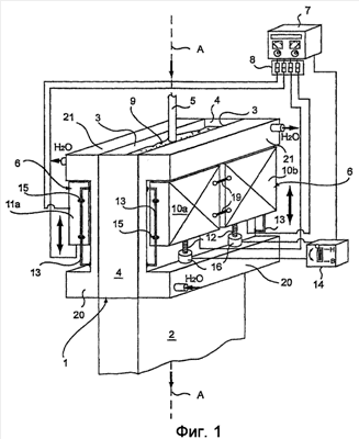 Устройство 6 электромагнитного перемешивания, соединенное с двух- или трехфазным источником 7 электрического питания, установлено напротив больших сторон 3 кристаллизатора. В частности, это устройство перемешивания установлено в нише, оставленной между верхней водяной камерой 21 и нижней входной водяной камерой 22, при этом обе камеры выполнены в виде кессонов высотой примерно 20 см каждый, установленных сразу за концевыми участками больших плит 3.