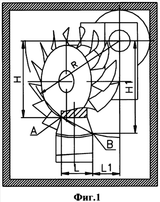 где Н и H1 – расстояние вдоль высоты лопатки 6 от оси вала 1 до крайних точек А и В диагонали лопатки 6, расположенных соответственно у обода моноколеса 4 и на торце пера лопатки 6, L и L1 – расстояния вдоль хорды лопатки 6 от оси вала 1 и теми же точками А и В.