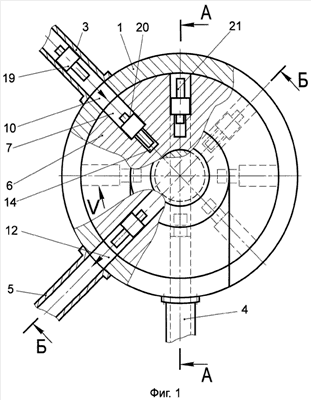 По мере поворота кольца 6 происходит совмещение радиального паза 7 с вырезом 18. Если в радиальном пазу 7 размещается правильно ориентированный стержень 20, то он задерживается гнездом 14, не опускается в вырез 18 и путем вращения кольца 6 транспортируется дальше, а при совмещении радиального паза 7 и гнезда 14 с выемкой 16 опускается в нее, смещается в радиальный канал 13, а по нему через проем 12 – в желоб 5. Если в радиальном пазу 7 размещается неправильно ориентированный стержень 21, то он за счет полуоткрытой канавки 15 не задерживается гнездом 14, опрокидывается в вырез 18, переориентируясь при этом в требуемое положение, смещается в тоннель 17, а по нему через окно 11 – в отводящий лоток 4.
