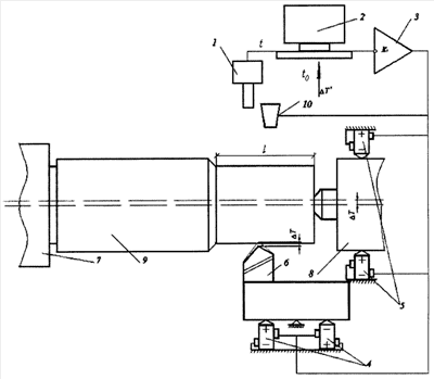 Цифровой сигнал значения температуры t0 задается в компьютере 2 до начала обработки детали на оборудовании с ЧПУ. Его значение определяется при расчете режимов резания в процессе обработки детали. Цифровой сигнал текущего значения температуры t с тепловизора 1 поступает на вход компьютера 2. В компьютере 2 определяется разность между заданным значением t0 и значением температуры резца t, полученной с тепловизора с цифровым выходом, T по формуле (1). Если разность T не превышает допустимое значение, то процесс обработки продолжается. Если значение T превышает допустимое, то необходимо с помощью исполнительного механизма 5 переместить заднюю бабку 8 на величину T. Для этого с выхода компьютера 2 подается управляющий сигнал на блок усиления 3 для пропорционального усиления и передачи его на вход исполнительного механизма 5 с целью смещения задней бабки 8 на величину T. Следовательно, производится коррекция температурного расширения резца на величину погрешности T. То есть производится компенсация температурной деформации резца в режиме реального времени.