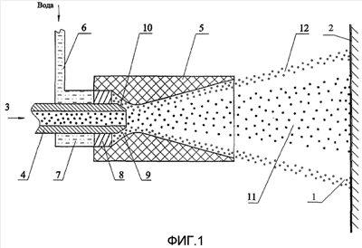 Устройство работает следующим образом. Предварительно подготовленная пневмоабразивная смесь подается по трубчатому элементу 4 в конфузорную часть сопла 5 Лаваля, где ускоряется и выбрасывается в виде высокоэнергетичной пневмоабразивной струи 11 на обрабатываемую поверхность 2. Одновременно, под давлением вода по каналу 6 поступает через кольцевую проточку 7 на вход завихрителя 8, в котором закручивается и в закрученном виде впрыскивается в зазор 9 в зоне критического сечения сопла 5 Лаваля. Далее, в виде тонкой пленки, вода распределяется по внутренней поверхности сопла 5 и выбрасывается наружу, образуя конусную локальную завесу 12 из распыленной воды. Вследствие этого, отработанный абразив вместе с продуктами очистки (шламом) оказывается внутри экранирующего контура, при этом увлажняется и отсаживается и может быть легко удален. Это дает возможность улучшить состояние окружающей среды по части запыленности в зоне обработки. Испытания показали, что на расстоянии 0,5 м от обрабатываемой поверхности диаметр основания конуса распыленной воды составляет около 0,2 м, при этом собственно смешения пневмоабразивной среды и воды в сопле до того момента, как произведена пескоструйная обработка, практически не происходит. Расход воды при критическом сечении 8-9 мм сопла Лаваля зависит от запыленности и составляет в среднем 300-400 мл на 1 кв.м обрабатываемой поверхности.