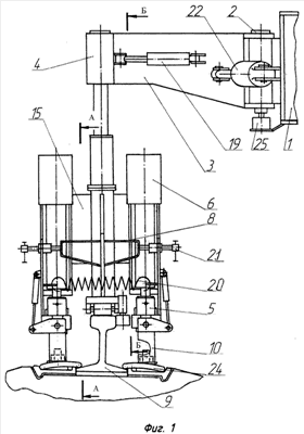 В рабочем положении устройства (фиг.1-4) каретка 11 пневмоцилиндром 13 установлена роликовой опорой 14 на верхней поверхности головки рельса 9 и посредством базирующих роликов 18, поджатых пневмоцилиндром 19 к боковой грани головки рельса 9, ориентирована относительно оси рельса 9, а искатели 10 опущены в нижнее положение и при непрерывном перемещении подвижной платформы 1 взаимодействуют с гайками 23 рельсовых скреплений 24, устанавливая рабочие головки 5 соосно рельсовым скреплениям 24 с применением фиксаторов 20 и пружин поджатая 21, которые фиксируют положение рабочих головок 5 относительно каретки 11. При дальнейшем перемещении подвижной платформы 1 производится поворот консоли 3 относительно оси 2, на которой она установлена, на определенный угол , соответствующий началу опускания рабочей головки 5 на гайку 23 и измеренный датчиком 25, который дает команды на вращение гидромоторов 6 и движения, выполняемые устройством при завинчивании и отвинчивании гаек 23 скреплений 24 рельсошпальной решетки. По окончании цикла пневмоцилиндром 17 производится подъем рабочих головок 5 и рабочим цилиндром 22 производится поворот консоли 3 на угол , соответствующий перемещению рабочей головки 5 на величину L в зависимости от расстояния между двумя или тремя гайками 23 рельсовых скреплений 24. По команде датчика 25 производится опускание искателей 10 и цикл работы устройства повторяется. После завершения работ пневмоцилиндром 13 каретка 11 с рабочими головками 5 поднимается в транспортное положение и фиксируется относительно подвижной платформы 1.