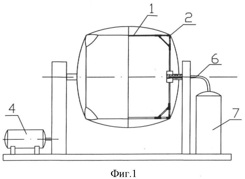Для изготовления сборно-разборного каркаса используются трубчатые металлические детали 1, которые соединяют при помощи соединительных элементов 2. Каркас устанавливается и закрепляется на стенде 3 с возможностью вращения вокруг своей горизонтальной оси. Вращение обеспечивается при помощи привода 4. Установленный каркас полностью покрывается материалом 5, который выбран для оформления внутренней стороны сооружения, например брезентом. Края материала соединяются, например, при помощи клея. Во внутреннюю полость образованной замкнутой оболочки через воздуховод 6, проложенный по оси вращения, нагнетается воздух от пневматического напорного устройства 7 под давлением 30 мм вод.ст. Такой напор является достаточным для того, чтобы замкнутая оболочка обшивки приняла форму, обусловленную физическими свойствами данного конкретного материала. После чего включается привод, который приводит во вращение обшитый каркас со скоростью 0,2 об/мин. На поверхность вращающегося обшитого каркаса с помощью оборудования для напыления наносится пенополиуретановая смесь «Alfapur 2502S». Плотность смеси составляет 40 кг/м3, толщина слоя ~100 мм. После отверждения первого слоя полиуретановой смеси, которая происходит в течение 15 мин, на поверхность наносится невспененный полимер SS100 со стекловолокном. Затем на армирующий материал наносится второй слой пенополиуретановой смеси, толщиной слоя ~100 мм. В описанном примере два слоя полиуретановой смеси, укрепленные армирующим материалом, обеспечивают заданную прочность и термоизоляцию. Для защиты от внешнего воздействия наносят дополнительный слой из эластичного невспененного полимера – полимочевины SS 100. После отверждения последнего слоя готовое сооружение снимается со стенда, в нем вырезается проем для двери, через которое удаляется разобранный каркас, так как сооружение полностью удовлетворяет заданным прочностным свойствам.