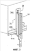 Две соединительные детали 24 закреплены на опоре и отстоят на некотором расстоянии друг от друга. Указанные соединительные детали закреплены на задней стороне 14А короба 14, то есть на той его стороне, которая повернута в направлении к внутренней стороне здания. На фиг.2 показаны также кулисы 26, каждая из которых способна скользить в направлении гидроцилиндра 12.