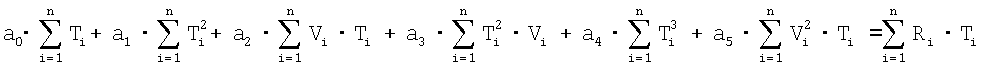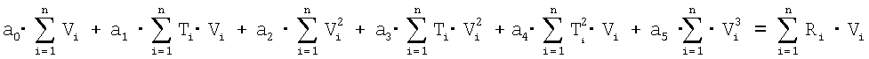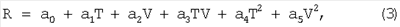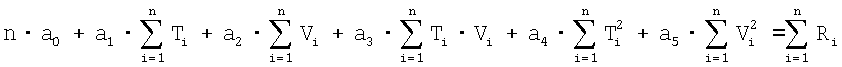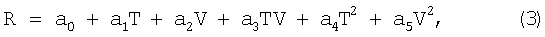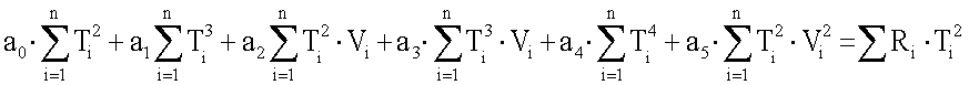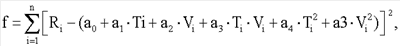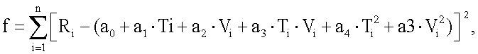 Обработка результатов эксперимента осуществлена методом регрессионного анализа. Анализ результатов эксперимента в плоскости параметров R-T для ряда фиксированных значений V=const показал, что искомая функция F может быть аппроксимирована квадратичной по параметрам Т и V зависимостью: где а0, Значения коэффициентов a0, где n – общее число экспериментальных точек в таблице; Ti, Vi – значения параметров Т и V из таблицы. Проведенный поиск минимума функции (4) по параметрам а0,