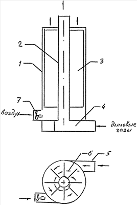 Таким образом, предлагаемое техническое решение позволяет использовать для работы аэродинамических установок тепло дымовых газов, расширяя тем самым область применения аэродинамических установок для утилизации тепловых отходов.