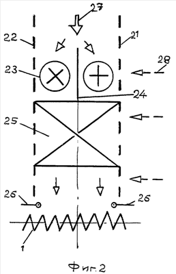 Устройство включает газопроницаемые поверхности шахты 21 и 22 со стороны подачи и выхода агента сушки соответственно, мешалки-дозаторы 23, разделительную пластину 24, инвертор 25, разгрузочное устройство 1, места для отбора проб на влажность 26 (фиг.2). Позициями 27 и 28 обозначен поток материала и агента сушки соответственно.
