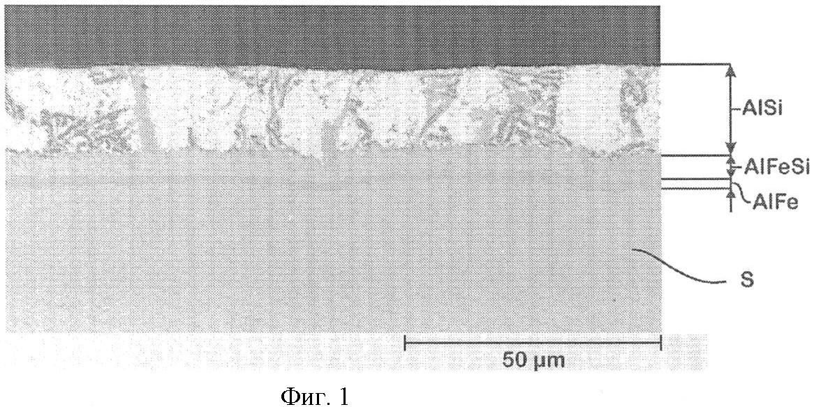 В ванне с расплавом несущая AlFe-слой стальная полоса S была покрыта AlSi-слоем. За счет возникающих в процессе нанесения покрытия погружением в расплав диффузионных процессов при этом образовался промежуточный AlFeSi-слой, состоящий, в основном, из Al, Fe и Si. Толщина этого промежуточного AlFeSi-слоя больше толщины сцепленного непосредственно с поверхностью стальной полосы S AlFe-слоя, однако заметно меньше толщины внешнего, состоящего, в основном, из А1 и Si AlSi-слоя (фиг.1).