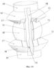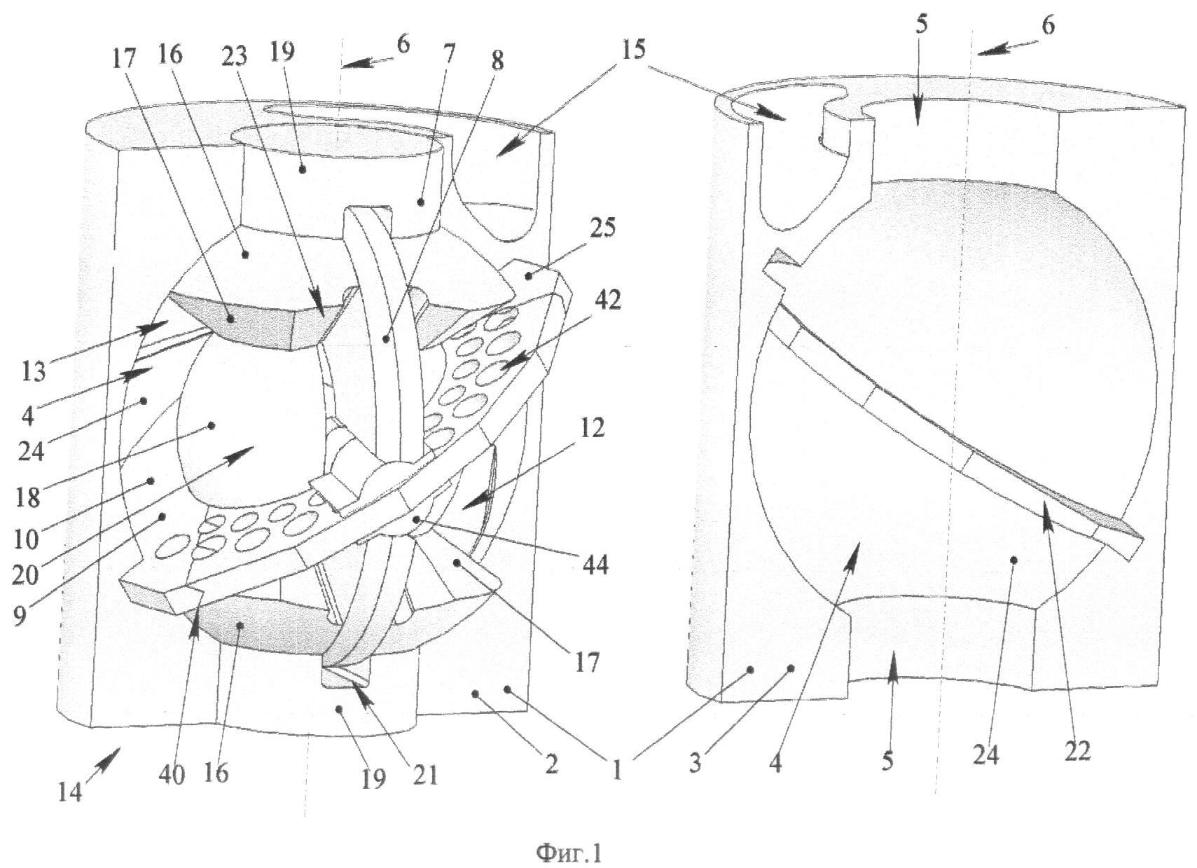 На фиг.12 показан разделитель 9, выполненный в виде многоугольника. Такая форма упрощает выполнение канавки на сферической поверхности 4 корпуса 1 для крепления разделителя 9. Для прочности деление разделителя 9 выполнено на две не равные части. Меньшей сделана часть 11 со сквозными проходами 42 (напорная), т.к. она испытывает только продольную нагрузку от перепада давления, в отличие от другой (перепускной) части 10. Разъем 40 выполнен в виде ступеньки, выходящей в центре разделителя 9 на диаметрально противоположные точки (или несколько далее на напорную часть). При сборке желательно дополнительно зафиксировать разъем 40 при помощи контактной сварки или другого известного метода. На стыке внутренней сферической поверхности 41 с боковой (плоской) поверхностью выполнена фаска 74. В этом случае ответная фаска 72 выполняется на роторе 7 (фиг.10).