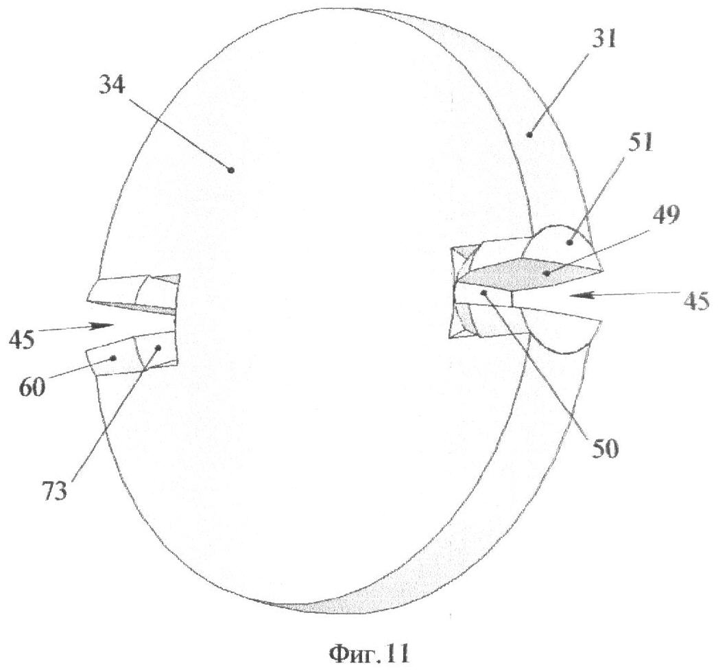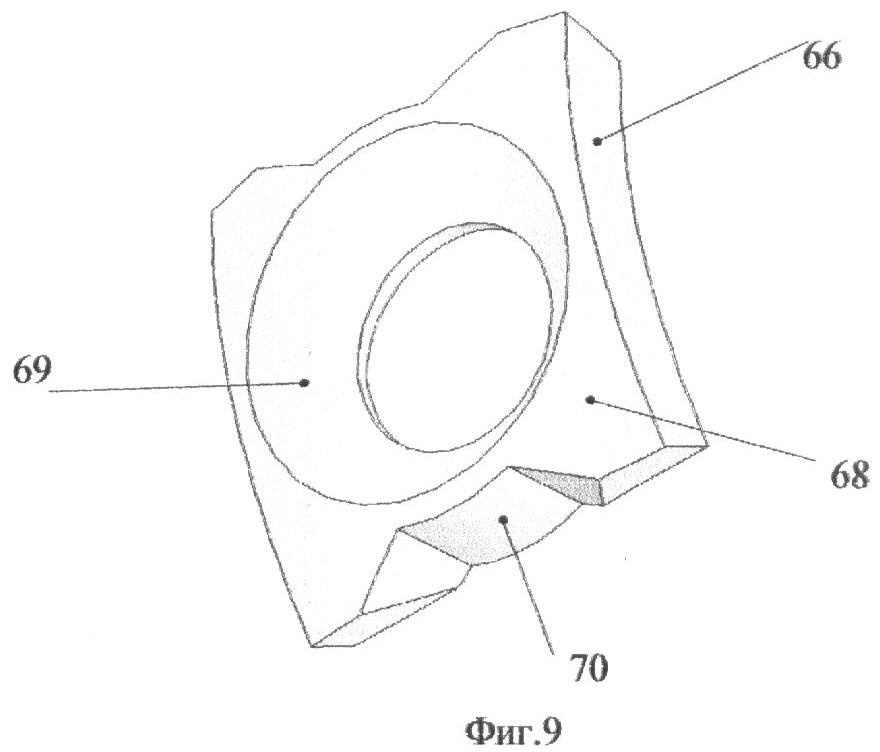 На фиг.8 показан поршень 8 с шайбой 65, которая устанавливается в прорезь 33 поршня 8 после его установки в прорезь 21 ротора 7. Шайба 65 функционально имеет четыре стороны, две 66 из которых плоские (конические) и две 70 имеют форму, ответную боковым стенкам прорези 33 поршня 8 (для фиксации в ней). Дно 67 шайбы 65 цилиндрическое (может быть сферическим), верх 68 сферический. В ней выполнено конусное (цилиндрическое) отверстие 69 под УСЭ 44. На роторе 7 в этом случае требуется выполнить канавки 71 вдоль стыка центральной сферы 18 с прорезью 21 (фиг.10). Прорезь 33 поршня 8 требуется углубить для размещения шайбы 65. В увеличенном виде шайба 65 показана на фиг.9.