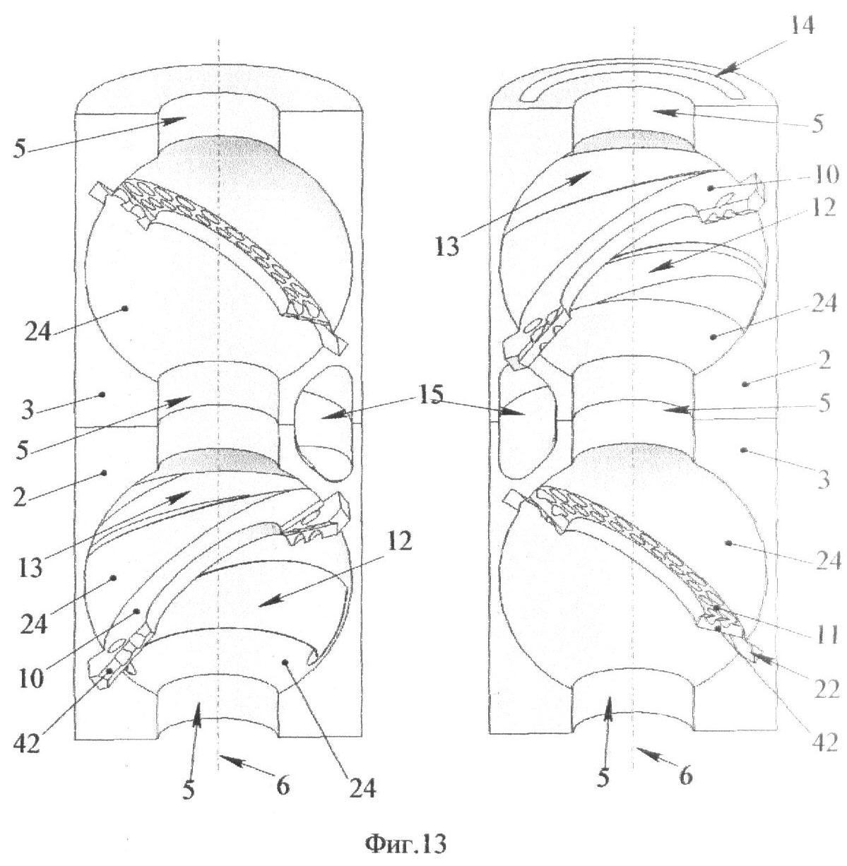 На фиг.13 показано как стыкуются две ступени корпусов ОРМ из фиг.1. Для разгрузки вала ОРМ от радиальной нагрузки две ступени стыкуются между собой с разворотом на пол оборота относительно оси 6 машины. Из таких блоков можно набирать машину с большим числом ступеней. Для жесткости (поскольку каждая ступень ОРМ создает довольно большое давление) желательно выполнять продольную половину корпуса, состоящего из нескольких ступеней цельной. Однако это часто (в зависимости от имеющегося оборудования) нетехнологично. Ротор многоступенчатой машины еще важнее выполнять цельным из двух, четырех или более ступеней. Он может получаться просто сложением отдельных ступеней (без разворота).