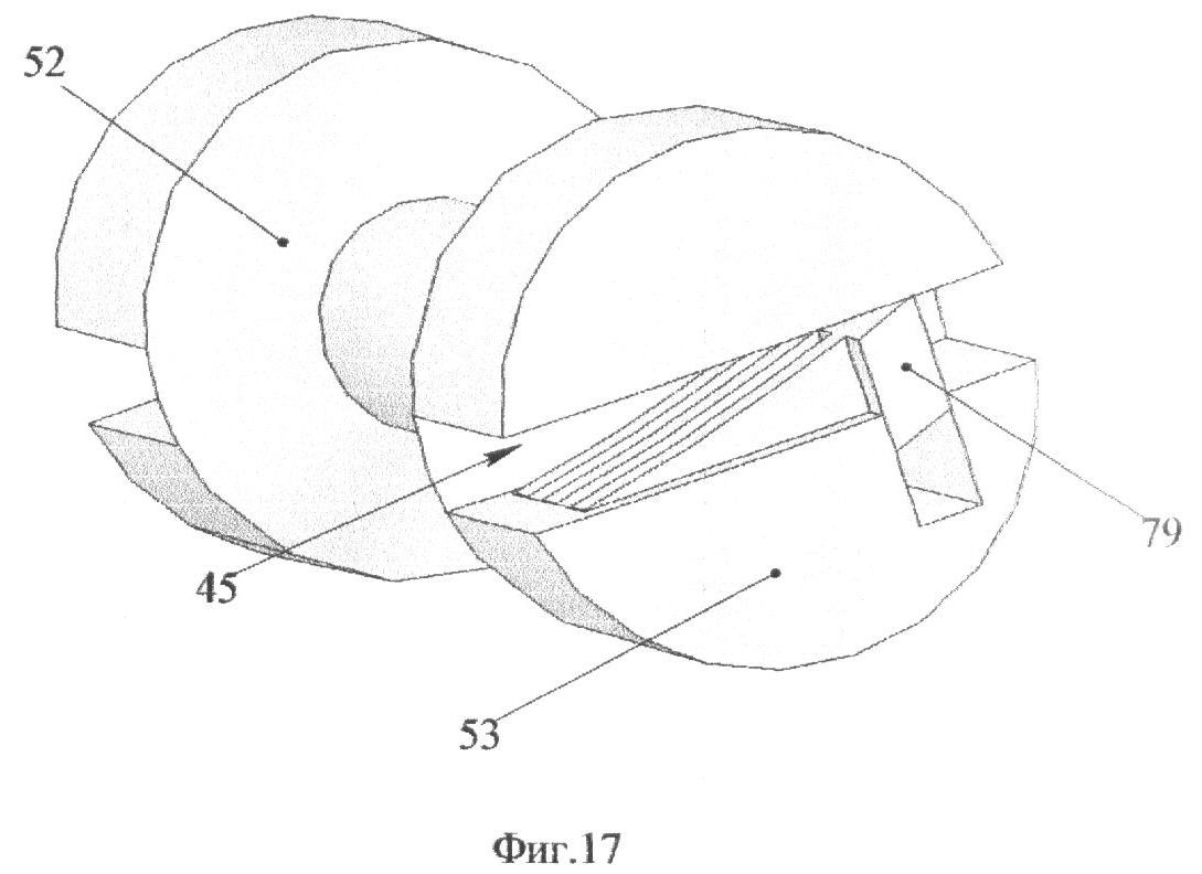 На фиг.16 – в изометрии в разобранном виде узел варианта ОРМ по фиг.15, состоящий из разделителя, ротора, вставок в ротор, поршня и УСЭ.