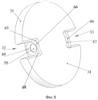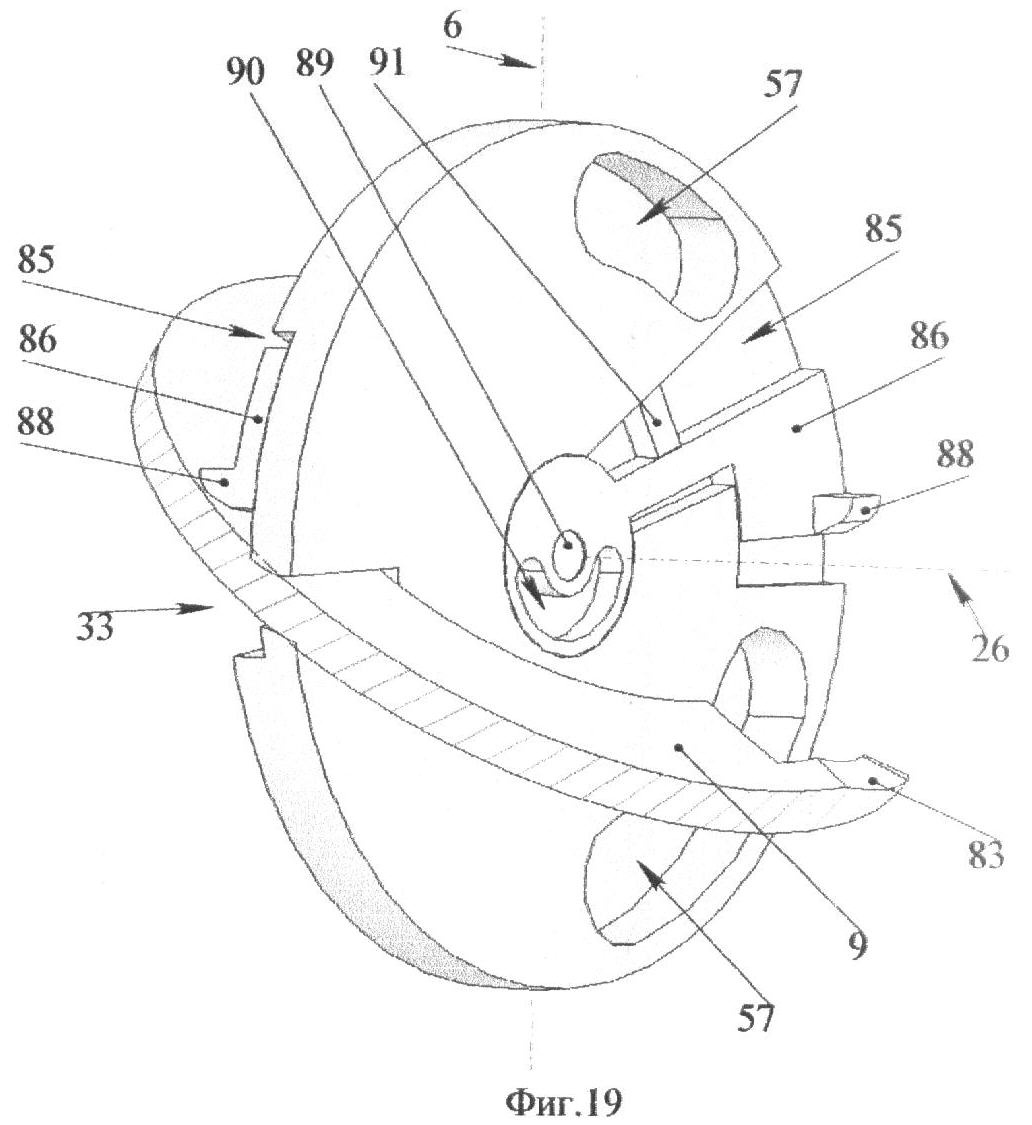 Вариант исполнения ОРМ по фиг.18 отличается от варианта по фиг.15 отсутствием УСЭ 44. Его роль в перекрытии прорези 33 поршня 8 выполняет новый элемент – заслонка 86. Для его установки на плоской части поршня выполнен паз 85, представляющий собой цилиндрическое углубление в центре соединенное с сектором, выходящим в окрестности паза 33 (фиг.19). В пазу 85 с возможностью вращения установлена заслонка 86, представляющая собой круг, соединенный ножкой с площадкой. Дальняя сторона площадки ограничена сферической поверхностью для уплотнения по сфере 24 корпуса. Ближняя – тоже по сфере, но меньшего радиуса для контакта по сферическому дну прорези 33 поршня 8. На круговой части заслонки 86 выполнен паз 90 в виде дуги. На противоположном конце поршня 8 на противоположной его стороне (симметрично относительно вертикальной оси) выполнен такой же паз 85, и в нем расположена еще одна заслонка 86. Две заслонки 86 могут быть неподвижно состыкованы между собой осью 89 через отверстие в центре поршня 8 или подпружинены упругим элементом 91 в сторону перекрытия прорези 33. Запрессованный в отверстие в роторе 7 (не показано) в прорезь 21 ротора 7 выставляется штифт, который попадает в канавку 90 заслонки 86. Его цель – останавливать заслонку 86 при движении прорези 33 поршня 8 вниз на высоте, при которой заслонка 86 не врежется в заход 83 (т.е. открывать прорезь 21 перед разделителем 9). Дополнительно на заслонке может быть выступ 88, а на разделителе – заход 83 для заслонки 86 и может быть сход 84. Форма рабочей поверхности выступа 88 похожа на часть функции косинус. Т.е. начальный участок вдоль скорости движения, далее угол изменяется. При набегании на заход 83 заслонка открывается. Выступ 88 на одной из заслонок 86 крепится к ней уже после вставки в паз 21 ротора 7 любым известным способом. Достаточно одной из двух описанных систем открытия заслонки 86. Если две заслонки 86 соединены осью 89 неподвижно, то открытие (подъем) одной из них разделителем 9 ведет к принудительному закрытию (опусканию) другой. Дополнительно на фиг.19 показаны места для выборки 57 материала поршня 8, эффективно снижающие его инерционность для снижения инерционной нагрузки на разделитель 9. Места, близкие к плоскости разделителя 9, почти не создают инерционной нагрузки, т.к. движутся по естественным траекториям под действием центробежных сил инерции, прорезь 21 ротора выполняется плоской.