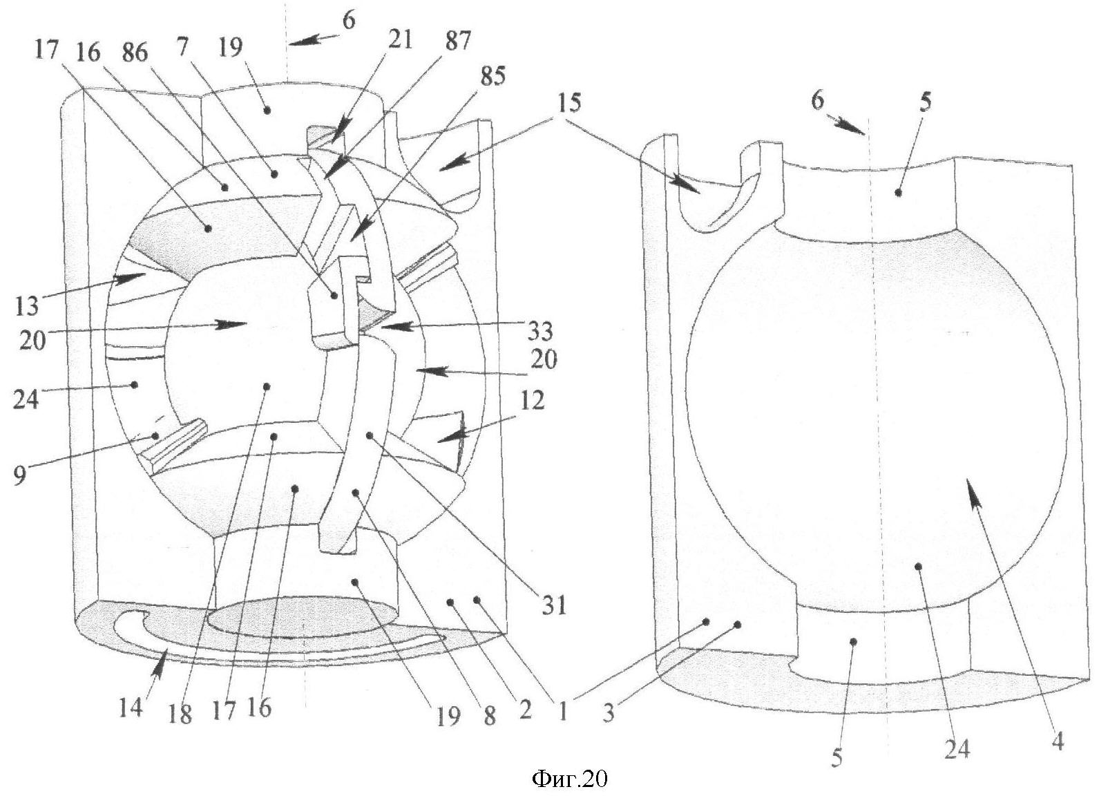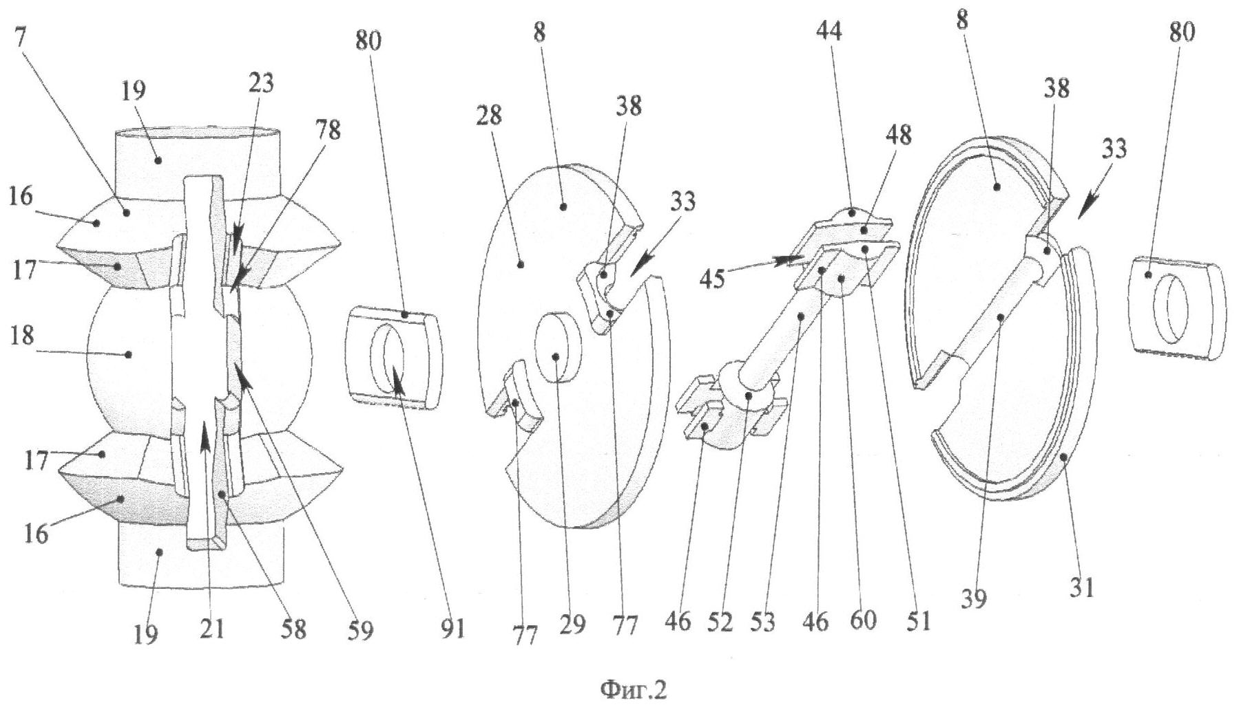 В пазу 21 установлен с возможностью вращательных колебаний вокруг геометрической оси 26, пересекающей перпендикулярно геометрическую ось 6 машины (другими словами, в плоскости паза 21), поршень 8 (фиг.1), выступающий в обе стороны из сквозного паза 21. Поршень 8 выполнен в виде диска, имеющего плоскую 28 и центральную утолщенную 29 части (фиг.2). На плоской части 28 имеются две диаметрально противоположные прорези 33 (фиг.7). На плоской части поршня 28 в районе прорези 33 для увеличения толщины поршня в этом месте выполнены выступы. Через паз 33 по диаметру выполнено сквозное отверстие 39. Оно имеет конические заходы 38 на небольшую глубину. Поршень 8 выполнен сборным из двух дискообразных частей. В отверстии 39 собранного поршня 8 установлен УСЭ 44, выполненный в виде двух цилиндров 60, соединенных осью 53. Торец каждого цилиндра 60 рассечен пазом 45 под разделитель 9 (фиг.2). Для увеличения площади боковой поверхности паза 48 на одной цилиндрической части 60 УСЭ 44, рассеченной пазом 45, выполнены выступы 46 (фиг.2, 14). В другую цилиндрическую часть 60 УСЭ 44, для разборности, такие выступы 46 вставляются в виде пластинок. Имеются окна входа 12 и выхода 13 рабочего тела, расположенные по разные стороны, соответственно под и над «восходящим» (перепускным) участком 2 разделителя 9 (снизу или сверху вдоль оси ротора 7), и примыкают к месту касания разделителя 9 с ротором 7 (фиг.2). При этом окна могут простираться по угловой протяженности на всю длину «восходящего» участка 3 разделителя 9 и даже залезать на площадки 82 контакта разделителя 9 с коническими поверхностями 17 ротора 7.