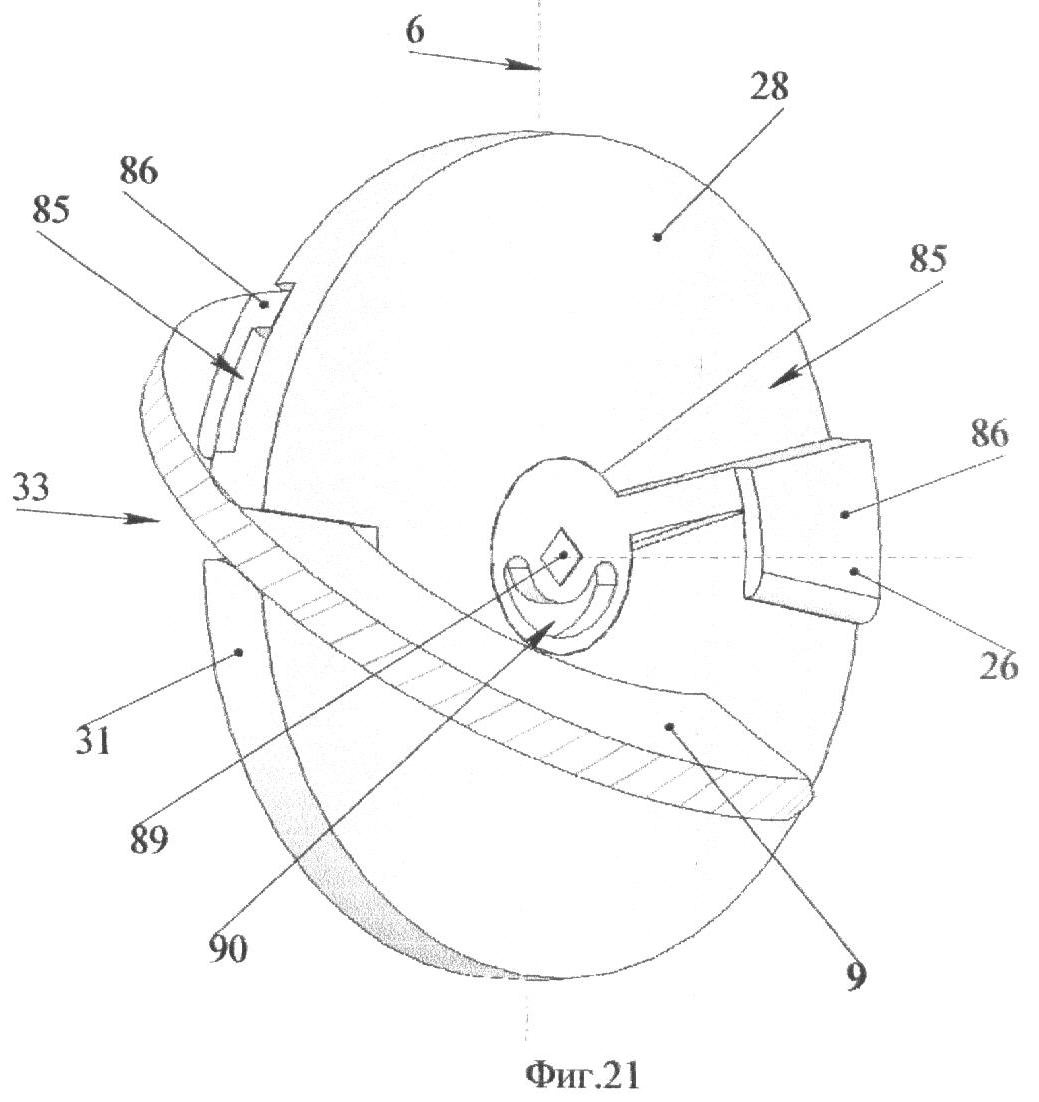 Вариант исполнения ОРМ по фиг.20 отличается от варианта по фиг.18 немного другим устройством заслонки 86. Ее площадка, перекрывающая прорезь 33 поршня 8, не лежит в пазу 85 поршня 8, а накладывается сверху на плоский торец 28 поршня 8. Это сделано для того, чтобы паз 85 не уменьшал рабочей площади прорези 33 поршня 8. Хотя для разборности придется крепить площадку заслонки 86 к ножке уже после вставки поршня 8 в прорезь 21 ротора 7 или использовать вставку.