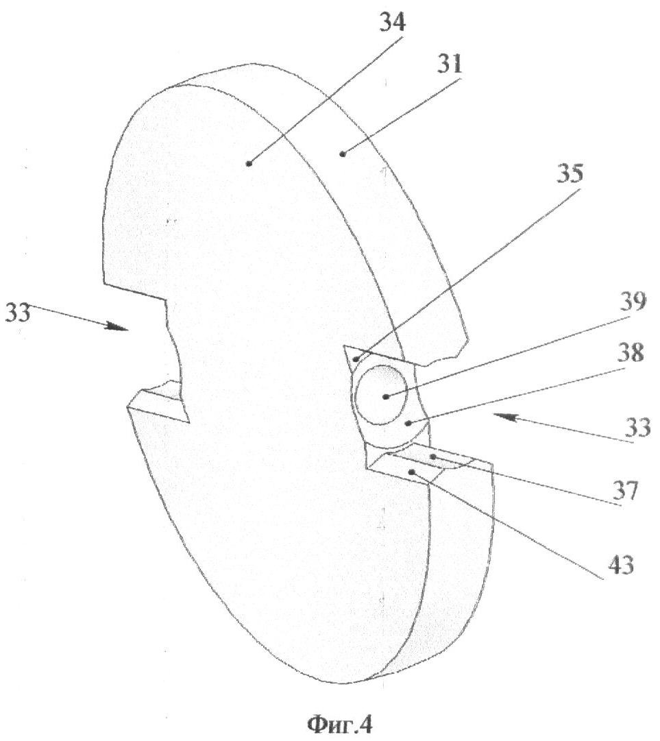Поршень 8 на фиг.4 выполнен в виде плоского диска (для возможности самоустановки в сферической полости 4 корпуса 1, 2, 3 и в прорези 21 ротора 7) со сферической боковой поверхностью 31. Торцы 34 поршня 8 выполнены плоскими, хотя допускаются небольшие отклонения (например, поднятие или обнижение середины поршня для регулирования момента трения поршня 8 в прорези 21 ротора 7) или смазочные и разгрузочные канавки, выборки 57 для облегчения, полости для жидкости (как в гидроподшипниках). На диаметрально противоположных сторонах диска выполнены сквозные прорези 33 для установки в них УСЭ 44. На боковой стенке 36 прорези 33 имеется цилиндрический участок 37, соединенный фасками 43 с торцевыми поверхностями 34 поршня 8. Дно 35 прорези имеет сферический участок, в центре которого выполнено цилиндрическое отверстие 39, идущее вдоль диаметра поршня 8. При выходе наружу отверстие становится коническим 38. Причем конус 38 выходит на торцевые поверхности 34 поршня 8. Это позволяет увеличить для прочности основание 52 УСЭ 44. Для простоты изготовления цилиндрическое отверстие 39 может выполняться сквозным, одного диаметра. Но более прочный поршень получается, если в центре поршня отверстие 39 проходит меньшим диаметром 62 (под штифт 47 УСЭ 44).