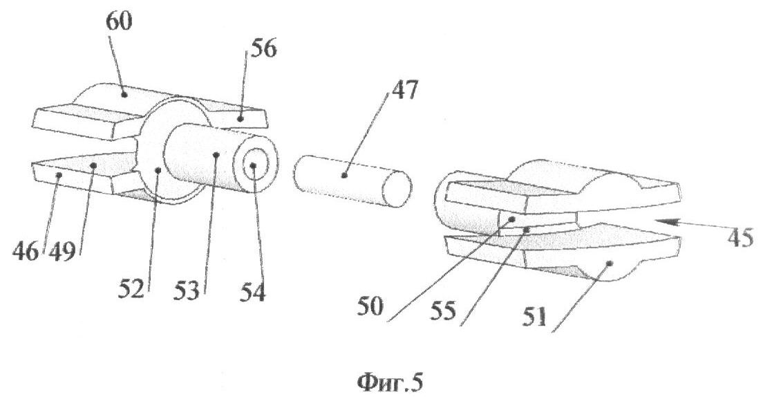 На фиг.5 изображен в разобранном виде УСЭ 44 для поршня 8 с фиг.4. Он состоит из двух одинаковых концов, соединяемых штифтом 47. На оси 53 УСЭ 44 имеется коническое основание 52, на котором имеется рассеченная сквозным пазом 45 цилиндрическая часть 60. На рассеченной цилиндрической части 60 имеются выступы 46, продлевающие сквозной паз 45. Дно паза 50 выполнено в виде участка сферы (для простоты и ввиду небольших размеров может выполняться в виде участка цилиндра или даже плоским). Чтобы минимизировать ослабление УСЭ 44 пазом 45, между дном паза 50 и его боковыми стенками 49 оставлены фаски 55 (радиусы округления). На противоположном торце оси 53 УСЭ 44 выполнено отверстие 54 под штифт 47, соединяющий два конца УСЭ 44. Диаметр конца оси 53 УСЭ 44, в который запрессовывается штифт 47, немного (например, на несколько соток) занижен. Цилиндрическая часть 60 УСЭ 44 имеет сферический торец 51 для контакта по сфере 4 корпуса 1 и сферический противоположный участок 56 для контакта по сфере 18 ротора 7.