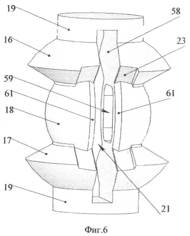 Участок ротора 7 (фиг.6), соответствующий одной ступени ОРМ, выполнен для работы с поршнем 8 с фиг.4 и УСЭ 44 с фиг.5. Между входным и выходным валами 19 ротора 7 имеется сферическая часть 16, в экваториальной части которой выполнен круговой паз. Дном паза является центральная сфера 18, а боковыми стенками паза служат конические поверхности 17. Через сферу 16, вдоль геометрической оси 6 вращения ротора 7, симметрично выполнен, для простоты, прямоугольный (не считая радиусов скругления) сквозной паз 21. Паз 21 может немного заходить на входной и выходной вал 19, а его короткие стороны могут быть не прямыми (например, дуга). На стыке паза 21 ротора 7 и центральной сферы 18 выполняются фаски 61 для плотного прохождения конического основания 52 УСЭ 44.
