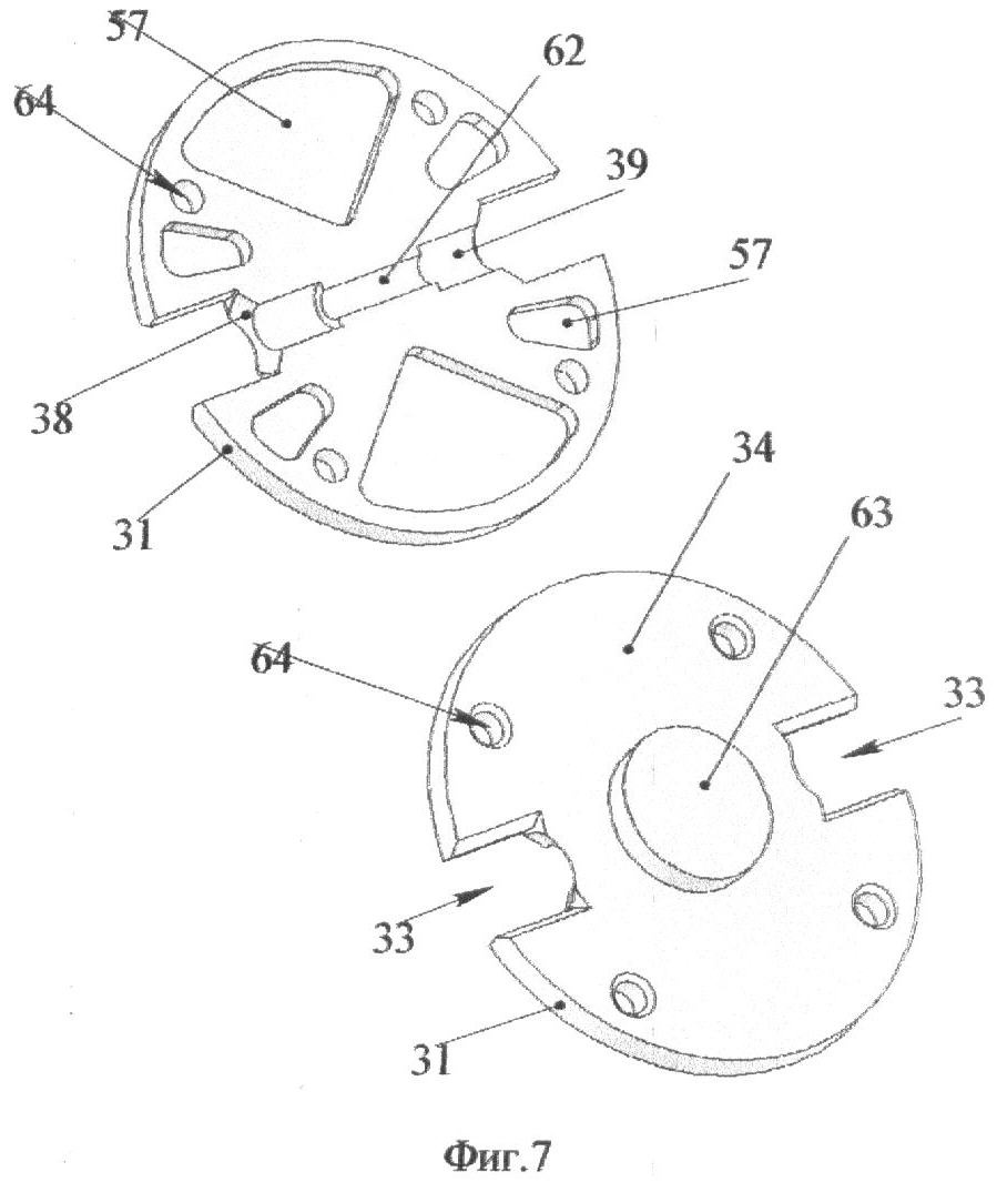 Для работы с таким поршнем 8 в центральной части паза 21 ротора 7, по меньшей мере, на одной из его сторон (фиг.6) выполняется углубление 59 произвольной формы, достаточное для размещения выступа 63. При самоустанавливающемся поршне 8 выступ 63 должен входить в углубление 59 с достаточным люфтом, а при использовании выступающей площадки 63 в качестве оси 27 люфт должен быть небольшим.