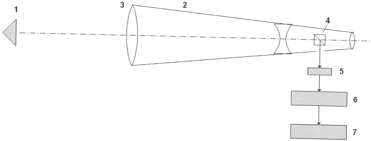 Устройство представляет собой роботизированный электронный тахеометр, содержащее лазер (на чертеже не показан) для наведения на визирную цель 1 и зрительную трубу 2 с приемным объективом 3, установленную по ходу луча светоделительную пластинку 4 и далее квадрант-детектор (ПЗС матрицу) 5, состоящий из четырех фотодиодов, каждый из которых через блок сопряжения 6 подключен процессору 7.
