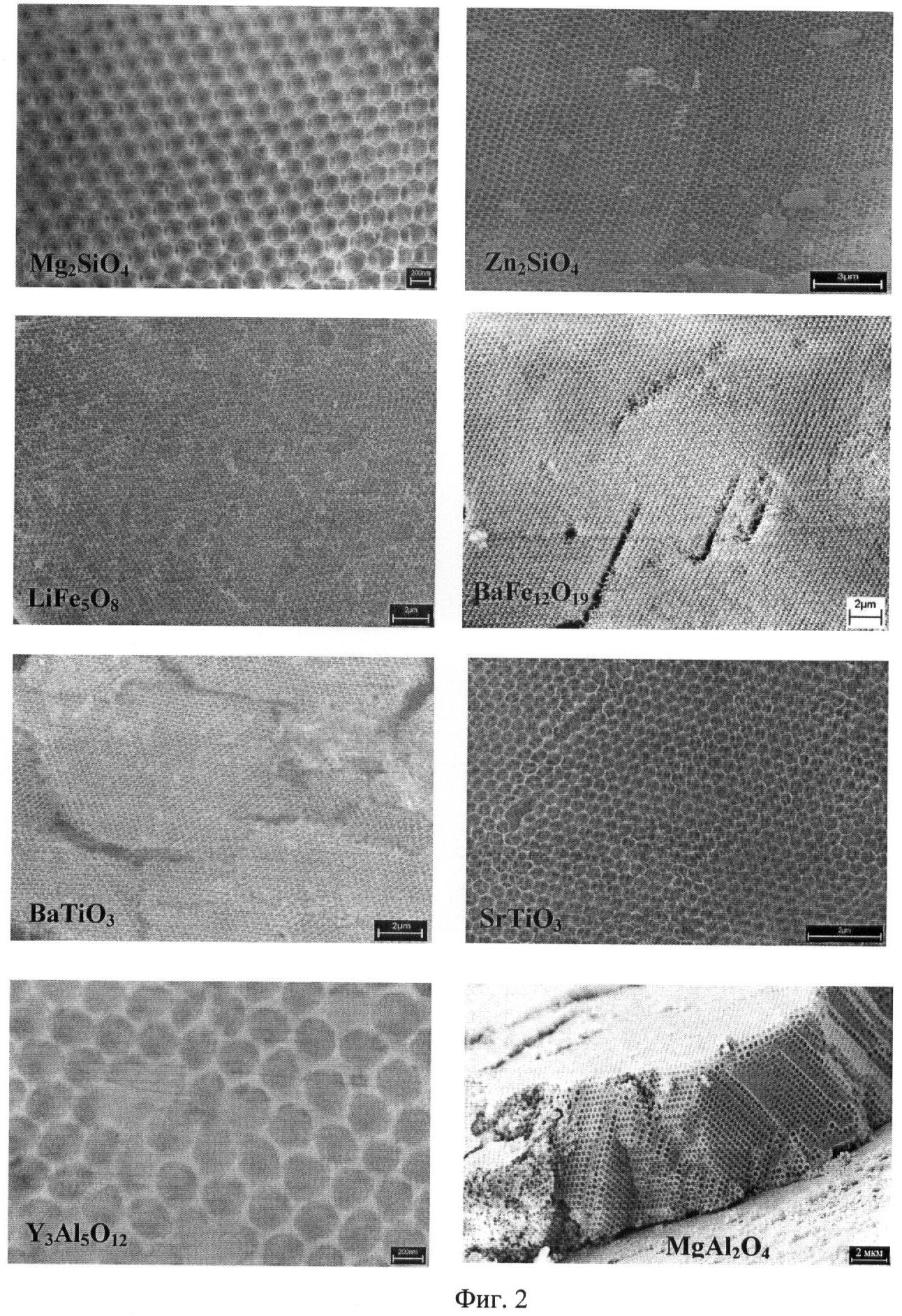 Мольные соотношения прекурсоров Zn(NO3)2:Si(OC2H5)4=2:1, Mg(NO3)2:Si(OC2H5)4=2:1, Ti(OC4H9)4:Ba(NO3)2=1:1, Ti(OC4H9)4:Sr(NO3)2=1:1, LiNO3:Fe(NO3)3=1:5, Ba(NO3)2:Fe(NO3)3=1:12, Mg(NO3)2:Al(NO3)3=1:2, Y(NO3)3:Al(NO3)3=3:5 выбраны из необходимости получения инвертированных фотонных кристаллов на основе материалов Mg2SiO4, Zn2SiO4, LiFe5O8, BaFe12O19, BaTiO3, SrTiO3, MgAl2O4 и Y3Al5O12, обладающих стехиометрией. Нестехиометричные материалы, указанные в заявке, характеризуются отсутствием уникальных оптических, электрических и магнитных свойств, что затруднит их практическое применение.