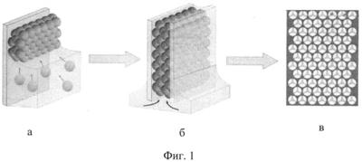 На последнем этапе формируется фотонный кристалл со структурой инвертированного опала фиг.1в. Для этого образцы подвергают медленному нагреву со скоростью 0,1°С/мин и последующему отжигу при температуре 500°С в течение 10 часов. В результате полистирольная матрица удаляется, а на месте ее пустот формируется необходимый материал требуемого состава.
