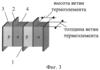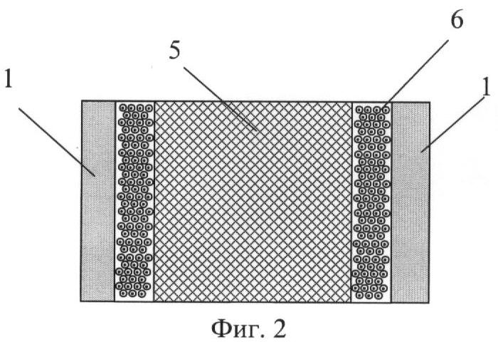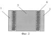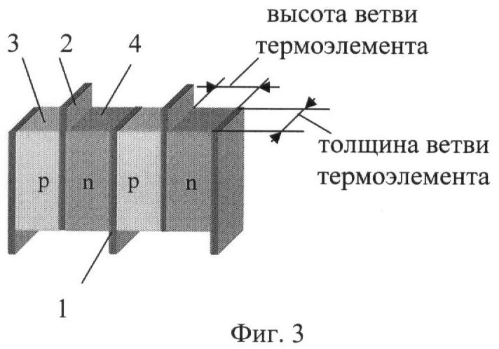 Конструкция термоэлектрической батареи приведена на фиг.1-3. ТЭБ состоит из последовательно соединенных в электрическую цепь посредством коммутационных пластин 1 и 2 чередующихся ветвей, изготовленных соответственно из полупроводника p-типа 3 и n-типа 4. Электрическое соединение ветвей осуществляют посредством контакта ветвь p-типа 3 – коммутационная пластина 1 или 2 – ветвь n-типа 4, где ветвь p-типа 3 контактирует торцевой поверхностью с одной из поверхностей коммутационной пластины, а ветвь n-типа 4 – с другой. Каждая ветвь в ТЭБ контактирует противоположными торцевыми поверхностями с двумя коммутационными пластинами 1 и 2. Коммутационные пластины 1 и 2 имеют площадь, несколько большую, чем площадь поперечного сечения ветвей p- и n-типа 3 и 4, вследствие чего их концы выступают за поверхность структуры, образованной ветвями ТЭБ. Концы нечетных коммутационных пластин 1 выступают за одну поверхность структуры, а концы четных коммутационных пластин 2 – за другую.