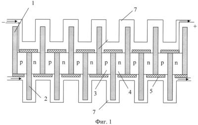 При прохождении через ТЭБ постоянного электрического тока, подаваемого от источника электрической энергии, между коммутационными пластинами 1 и 2, представляющими собой контакты ветвей p- и n-типа 3 и 4, возникает разность температур, обусловленная выделением и поглощением теплоты Пельтье. При указанной на фиг.1 полярности электрического тока происходит нагрев нечетных коммутационных пластин 1 и охлаждение четных 2. Съем теплоты с коммутационных пластин, а также с близлежащих к ним областей осуществляется за счет прокачивания жидкости в контактирующем с ними жидкостном теплообменнике 7.