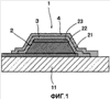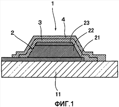 Согласно фигурам 1-2 позиция 1 означает органический EL дисплей по настоящему изобретению. Органический EL дисплей включает основу 11, выбранную из неорганического вещества, такого как стекло и т.п., и органических веществ, таких как высокомолекулярное соединение и т.п., а органическое EL-устройство 2 сформировано на поверхности основы 11. Органическое EL-устройство 2 состоит из первого электрода 21 дисплея, который образует анод, по меньшей мере одного органического функционального слоя 22, который состоит из органического соединения, и второго электрода 23 дисплея, который образует катод, причем эти электроды дисплея 21, 23 и органический функциональный слой 22 нанесены последовательно, и органический функциональный слой 22 находится между анодом и катодом.