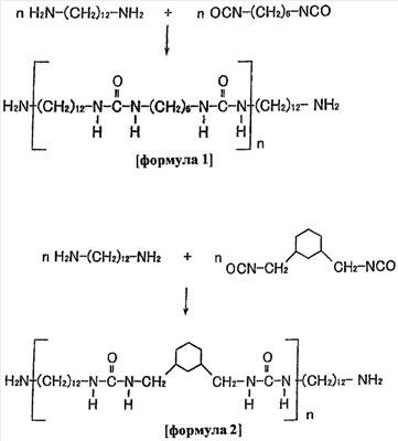 В качестве примеров мономерного алифатического диамина можно назвать 1,12-диаминододекан, 10-диаминододекан, 1,8-диаминооктан, 1,6-диаминогексан, 1,3-бис(аминометил)циклогексан и т.п. Далее, в качестве примеров мономерного алифатического диизоцианата можно назвать 1,3-бис(изоцианатметил)циклогексан, гексаметилендиизоцианат и т.п.