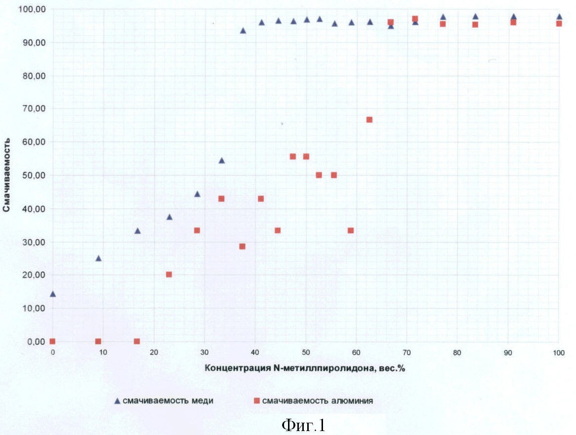 При концентрации N-метилпирролидона менее 70% ухудшается смачиваемость токоотводов (Фиг.1), а при концентрации N-метилпирролидона более 80% коагулирует (выпадает в осадок) желатин. Смачиваемость определяется следующим образом. На поверхность токоотвода, расположенного под постоянным углом к горизонтальной поверхности, наносится капля водного раствора