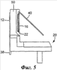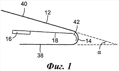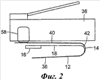 Как показано на сечении вида сбоку, изображенном на Фиг.1, контакты 12 описанного в заявляемом изобретении соединителя выполнены с изгибом, образующим в показанном примере осуществления изобретения острый угол между первым участком 38 и вторым участком 40 контакта 12 соединителя. Изгиб выполнен изогнутым, закругленным или дугообразным, как показано на Фиг.1. Первый участок 38 контакта выполнен с возможностью подсоединения к нему проводов (не показаны), как будет описано более детально на Фиг.10, и, как показано в примере осуществления изобретения, этот участок несколько короче второго участка 40. Однако первый участок 38 может иметь длину приблизительно такую же или больше длины второго участка 40. Второй участок 40 контакта выполнен с возможностью установления электрического соединения, предпочтительно непосредственного электрического соединения, с контактами ответной части (см. Фиг.2 с контактами 58 ответной части 36). Конденсатор обозначен цифрой 16 и имеет выводы, из которых только один вывод 18 показан на Фиг.1. Вывод 18 выполнен по существу прямым, отчасти короче первого участка 38 контакта, по существу параллельным ему, и имеет изогнутый участок 42 на своем свободном конце. Изогнутый участок в показанном примере осуществления изобретения по существу согласован с изгибом 14 контакта и образует угол приблизительно в 120°. Этот угол также может быть меньше.