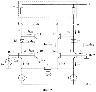 В схеме фиг.2 при uвх=0 выходные токи I8 и I9 складываются из нескольких составляющих