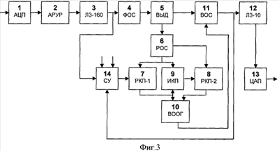 Поставленная задача решается также тем, что в устройство автоматического регулирования пиковых значений электрических вещательных сигналов на заданный уровень при стабилизации ОСМ, принятое за прототип (фиг.2), содержащее входной блок аналого-цифрового преобразования (АЦП), блок формирования ортогонального сигнала (ФОС), блок сигнала управления (СУ) и блок цифроаналогового преобразования (ЦАП), вход блока ФОС соединен с первым входом блока СУ, а выход – со входом блока выделения огибающей и косинуса мгновенной фазы сигнала (ВЫД), первый выход которого подсоединен к первому входу блока восстановления сигнала (ВОС), а второй выход соединен с входом блока разделения огибающей на НЧ и ВЧ составляющие (РОС), первый выход блока РОС соединен с входом первого блока регулирования коэффициента передачи составляющих (РКП-1) и первым входом блока измерителя коэффициента передачи (ИКП), причем второй вход блока РКП-1 подсоединен к выходу блока СУ, а выход блока РКП-1 и второй вход блока ИКП соединены с первым входом блока восстановления огибающей (ВООГ), второй выход блока РОС соединен с первым входом второго блока регулирования коэффициента передачи составляющих (РКП-2), второй вход которого соединен с выходом блока ИКП, а выход блока РКП-2 подсоединен к второму входу блока ВООГ, выход которого соединен со вторым входом блока ВОС, выход блока ВОС соединен со вторым входом блока СУ, причем выход блока ЦАП является выходом устройства, а два дополнительных входа блока СУ используются для установки пороговых уровней регулирования, в отличие от прототипа дополнительно введены блок инерционного авторегулирования уровня (АРУР), линия задержки на 160 мс (ЛЗ-160) и блок задержки на 10 мс (ЛЗ-10), причем вход блока АРУР соединен с выходом блока АЦП, а выход – с входом линии задержки ЛЗ-160, выход которой соединен с входом блока ФОС, вход блока ЛЗ-10 соединен с выходом блока ВОС, а выход блока ЛЗ-10 – с входом блока ЦАП.