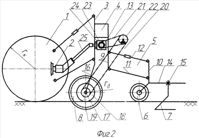 Передаточный механизм выполнен следующим образом. На валу 17 диска 8 жестко закреплена ведомая звездочка 19, которая через цепные передачи 20, 21, промежуточную звездочку 22 приводится в действие от ведущей звездочки 23, расположенной на выходном вале редуктора 24, установленном на раме 4, причем направление вращения диска совпадает с направлением вращения ведущих колес трактора 1. Входной вал редуктора 24 соединен с валом отбора мощности 2 с помощью карданной передачи 25.