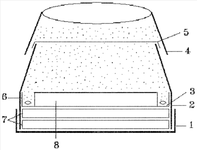 На чертеже (схематично) изображено устройство для определения силы роста семян при различной плотности почвы, включающее поддон 1, прозрачную емкость 2 для песка и ложе 3 для семян и отличающееся тем, что нижняя часть емкости 2 для песка представлена в виде цилиндра, а верхняя – в виде конуса, на верхнюю часть емкости надето конусное прижимное устройство 4, между емкостью и прижимным устройством размещен уплотнитель 5, а в нижней части емкости на поддоне установлены друг на друга округлая емкость 6, по краю которой размещено ложе для семян, и съемные уплотнительные кольца 7, причем в центре округлой емкости имеется выступ 8. Расчет нормы высева ведется по следующей формуле: