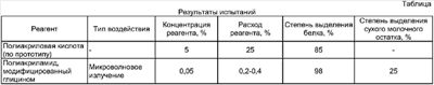 Изобретение относится к молочной промышленности, в частности к способам выделения компонентов молочной сыворотки. Известен способ выделения белков молочной сыворотки с применением в качестве реагента поли-N,N-диметил-N,N-диаллиламмонийхлорида (ПДМДААХ), выпускаемого в промышленных масштабах под торговой маркой ВПК-402 [1]. Недостатком данного способа является низкая степень выделения белка (70%); предварительный нагрев сыворотки, что приводит к дополнительным затратам. Наиболее близким к предлагаемому способу является способ выделения белковых веществ из молочной сыворотки путем введения в нее железосодержащей полиакриловой кислоты в количестве 0,3-1% от веса смеси с последующим выдерживанием смеси и отделением образовавшегося осадка (прототип) [2]. Недостатком данного способа является низкое количество выделенного белка (50-70%), значительная длительность процесса (30-90 мин), большой расход малодоступного реагента. Задачей предлагаемого изобретения является увеличение полноты выделения белковых веществ сыворотки с целью их дальнейшего использования, сокращение длительности процесса, снижение расхода добавляемого реагента. Поставленная задача достигается путем введения в молочную сыворотку водорастворимых полимеров – высокоанионного полиакриламида (ПАА), модифицированного глицином путем воздействия микроволнового излучения. Характеристика МВИ: частота 2,45 ГГц, мощность 100 Вт, продолжительность облучения раствора флокулянта – 4 секунды. Эксперимент проводят с натуральной творожной сывороткой при комнатной температуре (рН=4,2-4,6). Количество добавляемого флокулянта 0,2-0,4% от массы смеси. Образующийся комплекс компонентов с ПАА выпадает в виде хлопьевидного осадка, который легко отделяется фильтрованием. Степень извлечения белка составляет при этом 90-98%, а степень извлечения оставшегося сухого молочного остатка 20-25%. Высокая степень извлечения белковых веществ связана с большой молекулярной массой полиакриламида и особенностями химического строения его макромолекул, специфическим воздействием МВИ на структуру макромолекул. Пример К 100 мл молочной творожной сыворотки со значением рН 4,2-4,6, содержащей 0,8 г белка, при комнатной температуре добавляют 0,2-0,4 мл водного 0,05%-ного раствора полиакриламида, модифицированного глицином в количестве 0,15% от массы флокулянта путем воздействия микроволнового излучения в течение 4 секунд. Для модификации флокулянта используют микроволновое излучение частотой 2,45 ГГц, мощностью 100 Вт. Образовавшийся хлопьевидный осадок отделяют фильтрованием. Степень извлечения белка при этом составляет 98%, оставшегося сухого молочного остатка 25%. Результаты испытаний представлены в таблице. Как следует из таблицы, предлагаемый способ по сравнению с известным позволяет увеличить степень извлечения белка на 10-17%, снизить расход реагента, сократить продолжительность процесса выделения в 15-30 раз. Источники информации 1. Коагуляция сывороточных белков водорастворимыми полимерами. Пищевая технология, 2005, 2. Авторское свидетельство