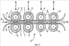 Фиг.3 иллюстрирует тот факт, что каждая из двух первых групп цилиндров имеет два цилиндра 5, оснащенных продольными шлицами 7, между тем как каждая из двух последних групп имеет два цилиндра 6, оснащенных продольными шлицами 8, причем цилиндры 6 имеют несколько меньший диаметр, чем цилиндры 5, а их шлицы 8 имеют меньшую глубину, чем шлицы 7.