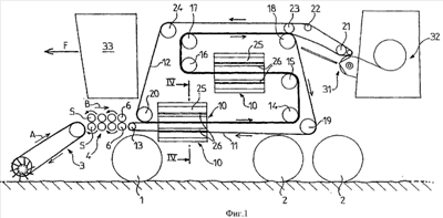 Здесь необходимо отметить, что ремни 11 и 12 приводятся в движение в направлении, показанном стрелками (не имеют номера ссылки на фиг.1), с помощью стандартных приводных устройств (здесь не показаны).
