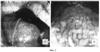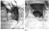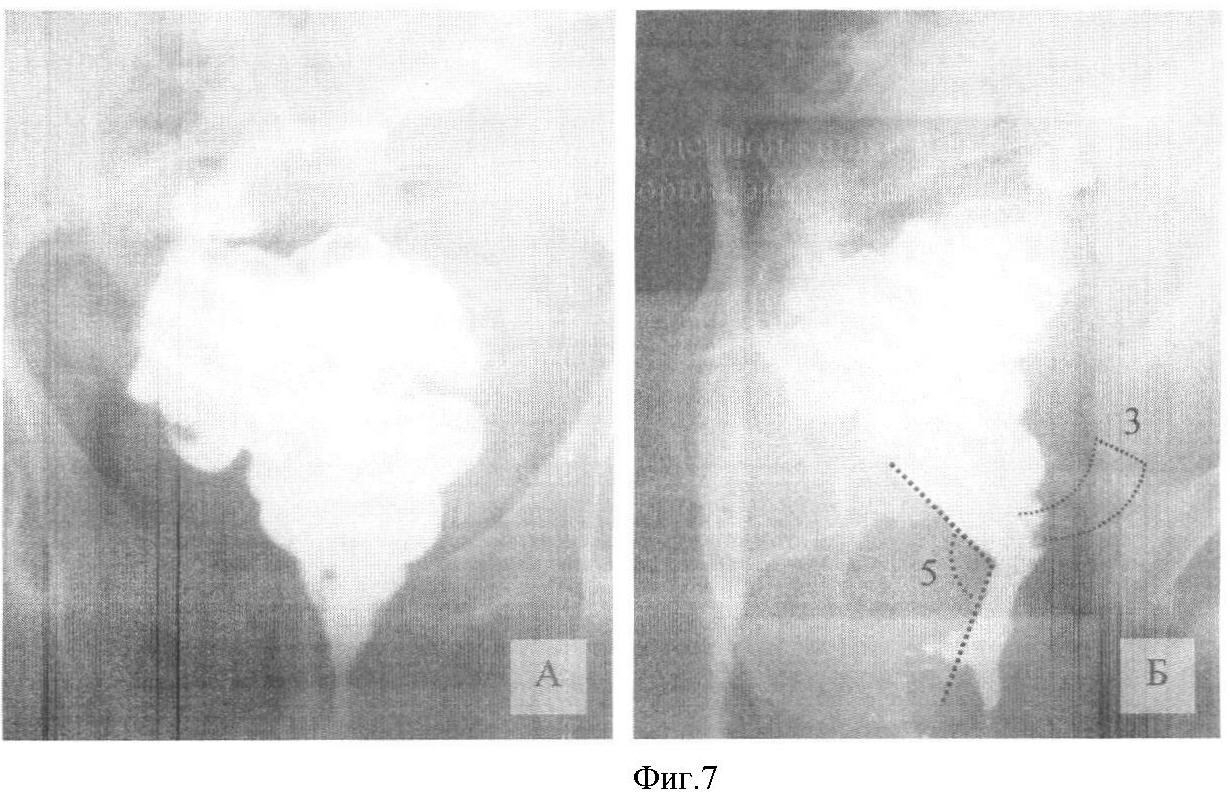 Резервуарография. С помощью контрастной клизмы дистальный отдел ободочной кишки беспрепятственно заполнен барием. Во фронтальной проекции за анальным отверстием определяется зона повышенного давления протяженностью 20-25 мм (фиг.7, А). Проксимальнее данной зоны кишка плавно переходит в резервуар, напоминающий естественную ампулу прямой кишки. Приводящая петля резервуара обычных размеров. В косой проекции между промежностным и тазовым отделами низведенной кишки определяется аноректальный угол, образованный за счет тракции сформированного гладкомышечного лоскута (фиг.7, Б). Величина угла в пределах 120°.