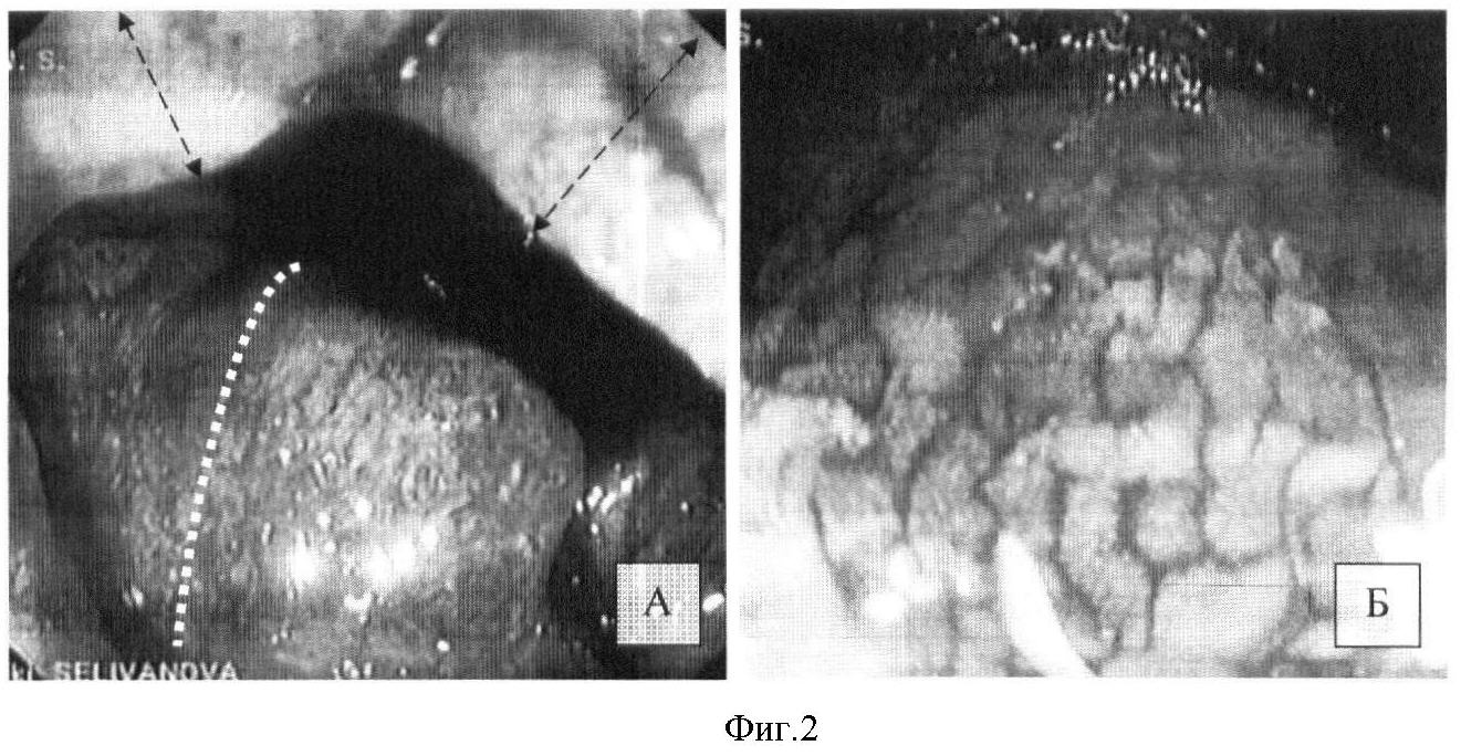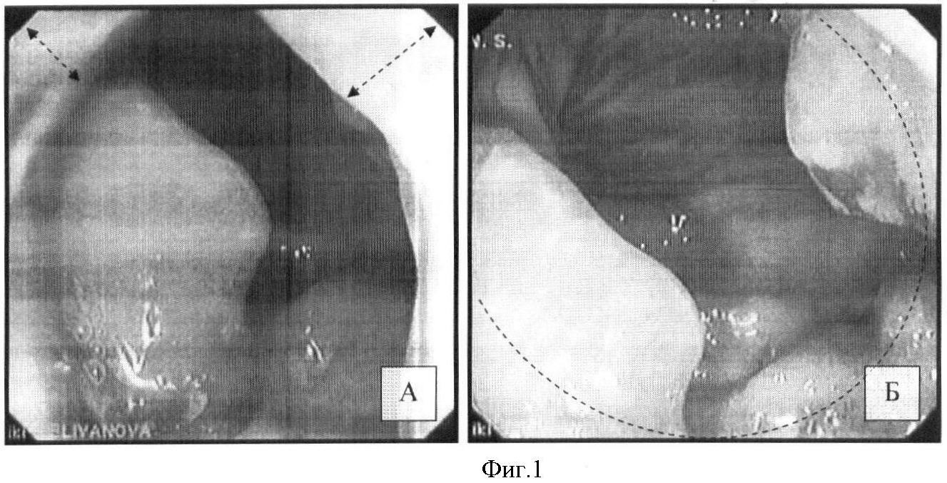 Фиг.1 – видеоколоноскопия: А – нижний край опухоли на границе нижнеампулярного отдела и анального канала (указан стрелками); Б – распространение опухоли по окружности нижнеампулярного отдела прямой кишки (указано пунктирной линией).