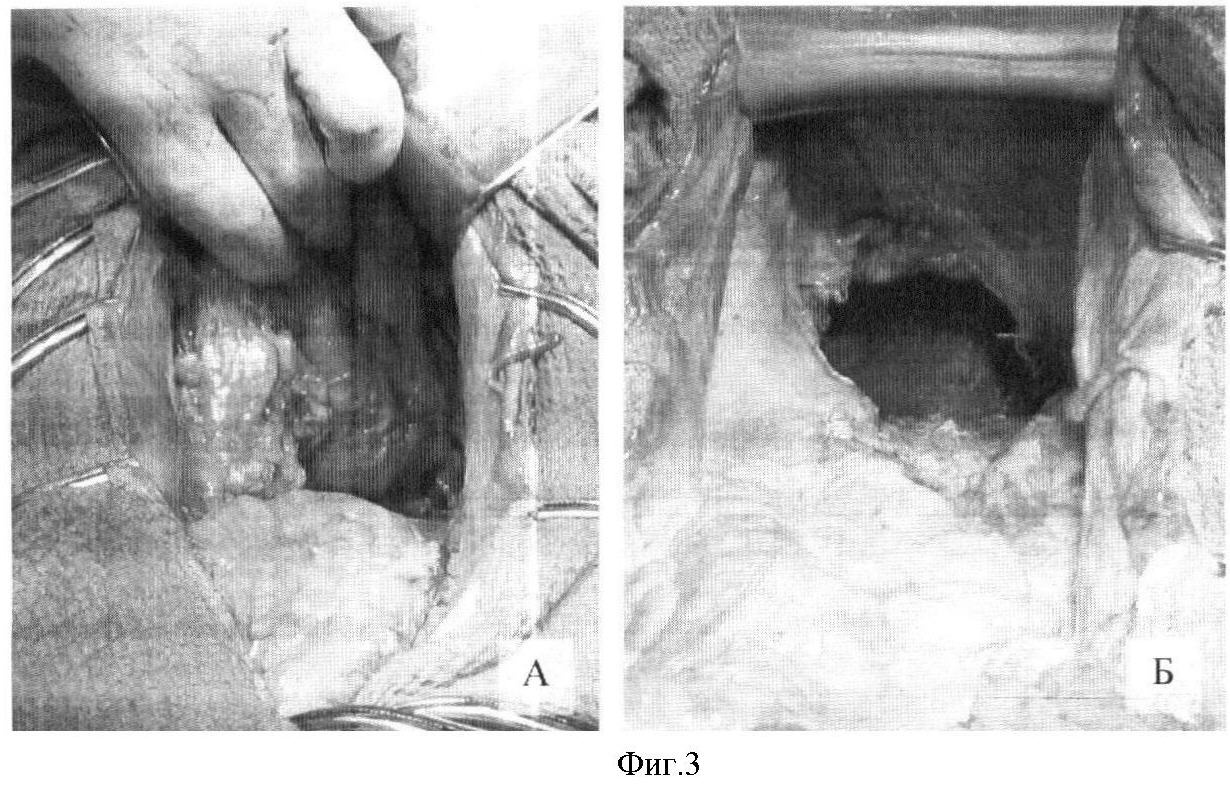 Нижнесрединная лапаротомия. При ревизии органов брюшной полости признаков отдаленного и регионарного метастазирования не выявлено. Диафрагмальная и висцеральная поверхность правой доли печени спаяны с сальником и передней брюшной стенкой (в анамнезе вирусный гепатит). При осмотре дна малого таза опухоль не определяется. Абдоминальным доступом выполнено рассечение брюшины по левому боковому каналу, дну малого таза с переходом на мезосигму. Лигирована верхняя прямокишечная артерия. По ходу нижней мезентериальной артерии определяются два увеличенных лимфатических узла с гладкой поверхностью до 7×8 мм и 8×12 мм, не спаянных с окружающими тканями, эластической консистенции. Произведена лимфодиссекция вдоль мезентериальной артерии (лимфоузлы направлены на гистологическое исследование). Мобилизована сигмовидная кишка для низведения, прошита механическим швом и пересечена. С некоторыми техническими трудностями, связанными с узким тазом, произведена тотальная мезоректумэктомия до уровня перехода леваторов в продольную мышцу анального канала (фиг.3, А). На конце сигмовидной кишки сформирован гладкомышечный жом путем отсепарирования серозно-мышечной оболочки высотой 15 мм и фиксации отдельными швами в форме манжетки. Выше гладкомышечного жома на 25 мм рассечена серозно-мышечная оболочка в поперечном направлении на 17 мм ширины противобрыжеечного участка кишки. Вдоль правого и левого краев брыжейки и подвесков противобрыжеечного участка кишки выполнены еще два параллельных рассечения серозно-мышечной оболочки длинной 65-70 мм. Намеченный таким образом прямоугольник из серозно-мышечного слоя отсепарирован от подлежащей подслизистой оболочки с сохранением его связи со стенкой кишки на проксимальном конце (фиг.4, А). Подслизистая площадка, образованная после формирования лоскута, растянута с помощью нитей-держалок в поперечном направлении и ушита узловыми швами до сопоставления серозно-мышечного слоя (фиг.4, Б). Промежностным доступом выполнена девульсия сфинктера и наложены 4 нити-держалки на уровне анокутанной линии. Просвет прямой кишки герметизирован кисетным швом на 1,5 см проксимальнее уровня нитей держалок и пересечен. Мобилизован внутренний сфинктер от подкожной порции наружного сфинктера в одном блоке с глубокой порцией наружного сфинктера, крестцово- и лонно-прямокишечной леваторными петлями. Препарат удален через промежность. Контроль на гемостаз и инородные тела. Через дополнительные разрезы на промежности справа и слева от ануса установлены два дренажа в малый таз так, чтобы боковое отверстие одной из дренажных трубок располагалось в верхней части, а другой – в нижней части малого таза. Полость таза промыта. Низведение сигмовидной кишки на промежность. С техническими сложностями, обусловленными ограниченной длиной сосудистой ножки трансплантата, произведена фиксация сигмовидной кишки узловыми швами по окружности края мышечной манжеты и подкожной порции наружного сфинктера. Отдельные узловые швы наложены между перианальной кожей и подслизистым избытком на низведенной кишке. Через абдоминальный доступ лоскут из серозно-мышечного слоя фиксирован аналогично проекции лонно-прямокишечной мышечной петли 4-мя узловыми швами по передней полуокружности тазовой брюшины соответственно проекции лонно-