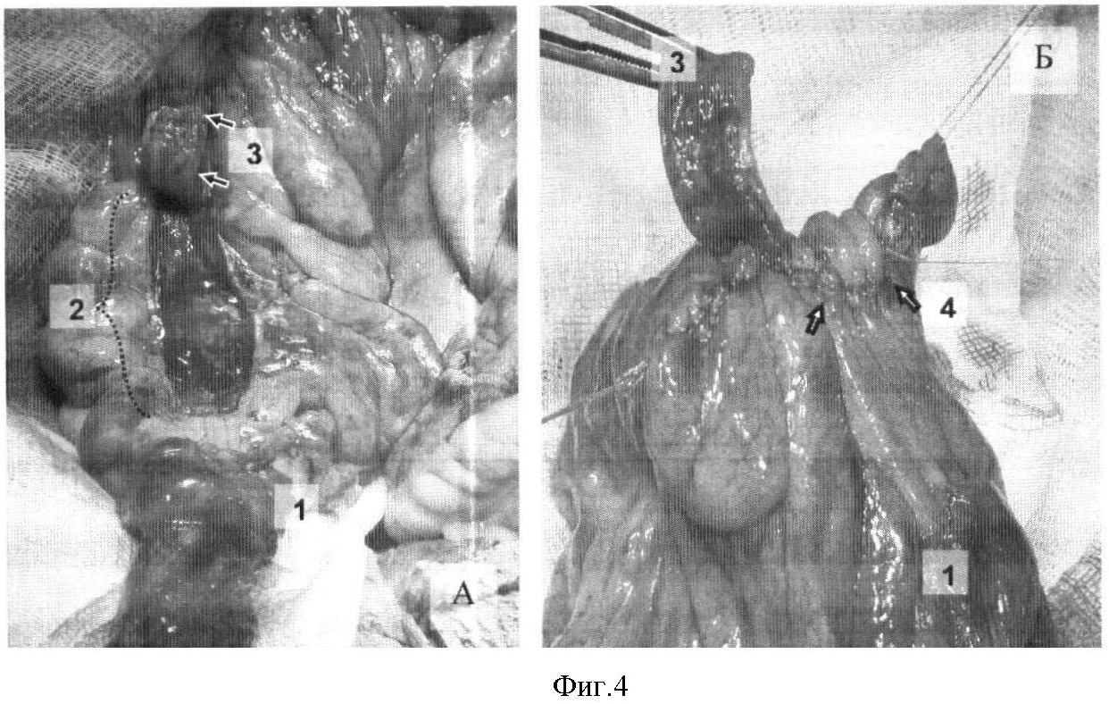 Фиг.4 – пластический этап: А – выше мышечной манжеты (1) сформирована подслизистая площадка (2) путем отсепарирования мышечного лоскута-леватора (3); Б – в основании лоскута (3) ушита подслизистая площадка (4) в поперечном направлении.